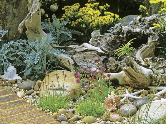 The rustic and weathered appearance of driftwood, paired with the smooth, naturally tumbled stones, adds a touch of seaside charm to your garden or patio.