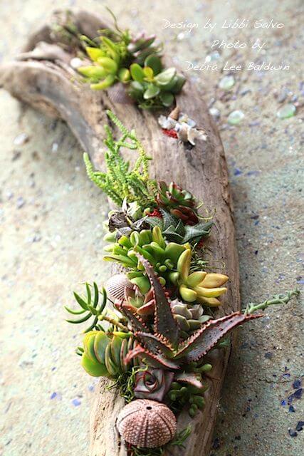 In this creative design, succulents are arranged on a piece of driftwood in a vertical or wall-mounted fashion, making it a living work of art.