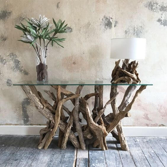 The driftwood console table often features a glass or wooden tabletop, providing a smooth surface for practical use or decorative displays. It adds a touch of coastal or rustic charm to your interior decor, making it an eye-catching and artistic addition to your home.