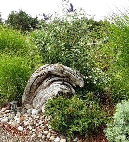 In this small landscaping, driftwood pieces are strategically placed along a dry creek bed, creating a visually striking and eco-friendly garden feature.