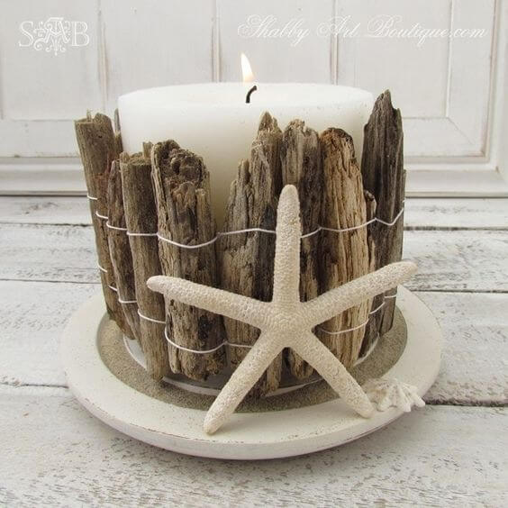 In this creative design, driftwood pieces are carefully assembled to create a candle holder, providing a naturally weathered and textured backdrop for single or multiple candles.