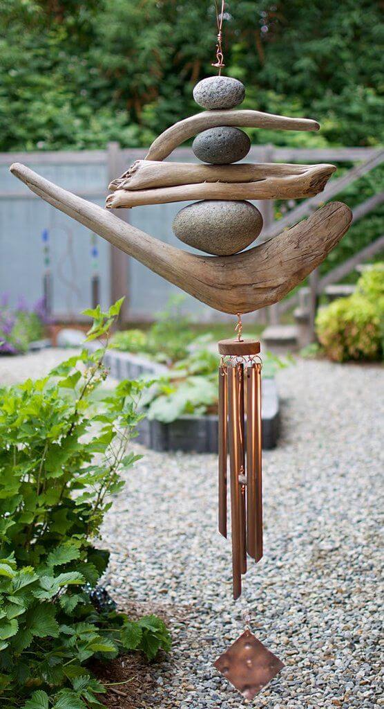 In this artistic design, driftwood pieces and beach stones are carefully arranged to form a wind chime that produces gentle and relaxing sounds as it sways in the breeze.