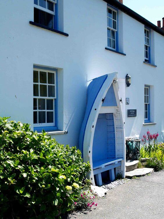 An old boat placed upright can be used as a sheltered seat. Add wooden planks across the inside to form a bench. Paint the interior for a cheerful look.
