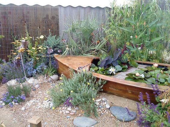 A long boat makes an excellent pond for aquatic plants. Line the boat with a pond liner to keep water from leaking. Plant reeds, lotus, or papyrus inside.