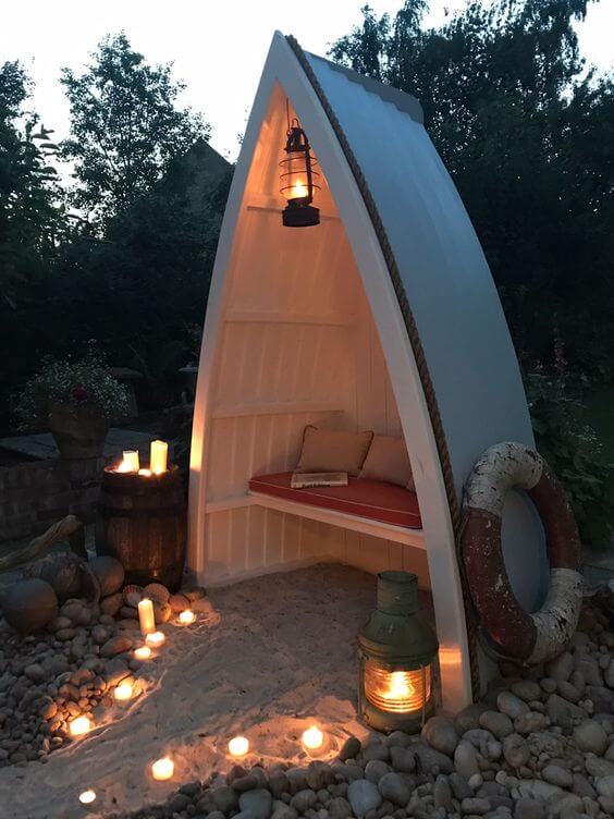 Small boats can be turned into patio seating. Cut the boat in half and place cushions inside. Add a small canopy or umbrella for shade.