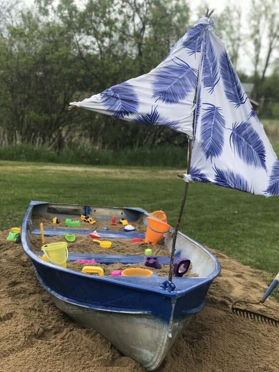 Turning a boat into a sandbox is a perfect project for families. Clean the boat and fill it with clean play sand. Place it in a shaded spot for comfort and safety.