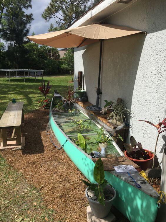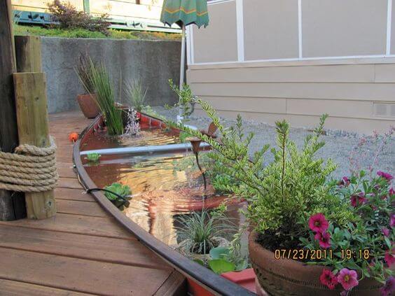 A canoe pond is narrow and perfect for tight spaces. Line the inside with waterproof material. Add water, aquatic plants, and even a few fish.