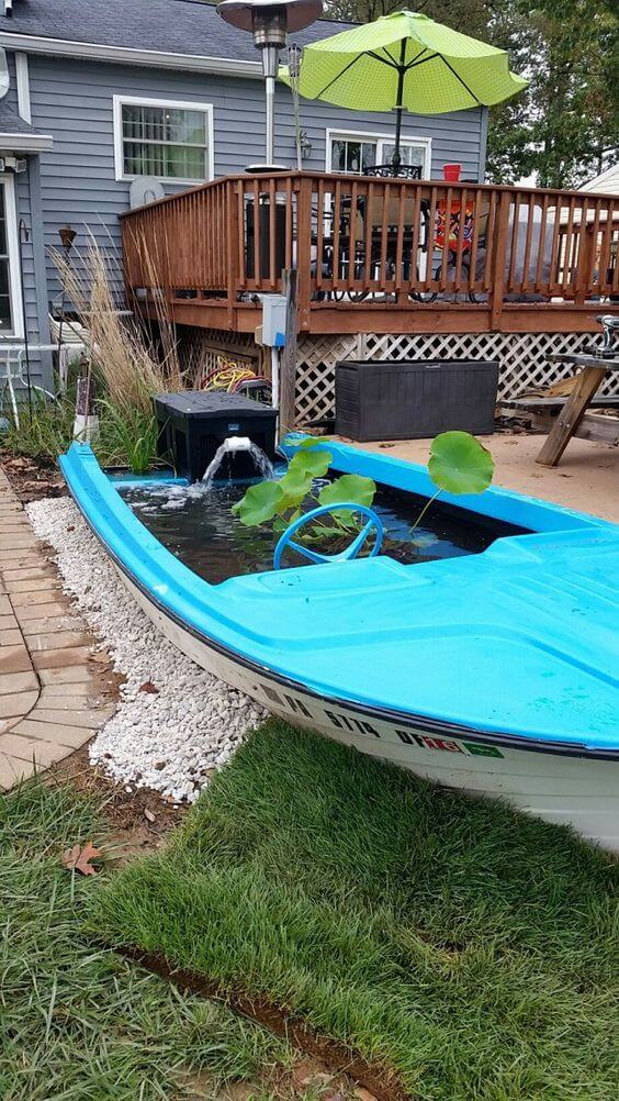 Add a small pump for gentle water circulation. Surround it with gravel or stepping stones. This project turns a large boat into a dramatic garden feature.