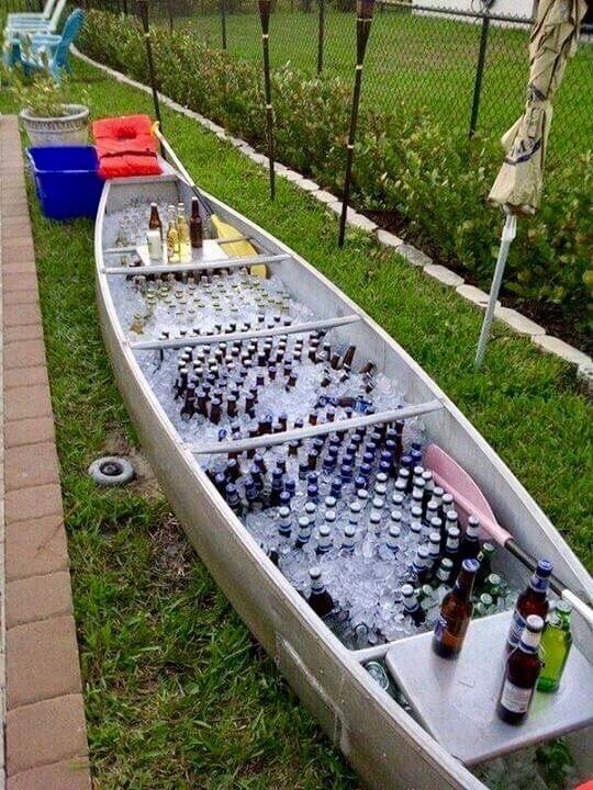 At parties, a boat cooler becomes the star. Clean the boat thoroughly and line it with a waterproof liner. Fill with ice and load up drinks.