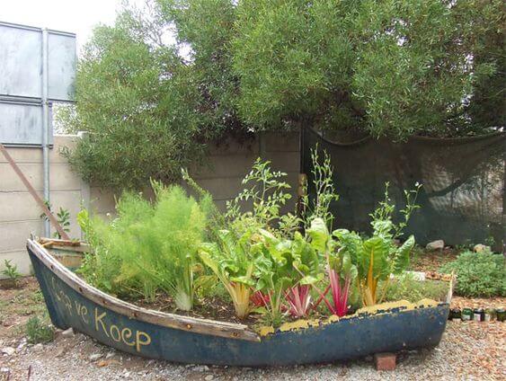 A boat can be turned into a raised bed that protects your plants. Fill it with soil and plant flowers, herbs, or shrubs. The height makes it easier to care for without bending.