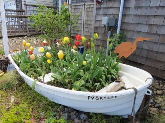Planting tulips inside a boat adds a springtime charm. Fill with well-drained soil and place bulbs in neat rows. Choose multiple colors for a bright display.