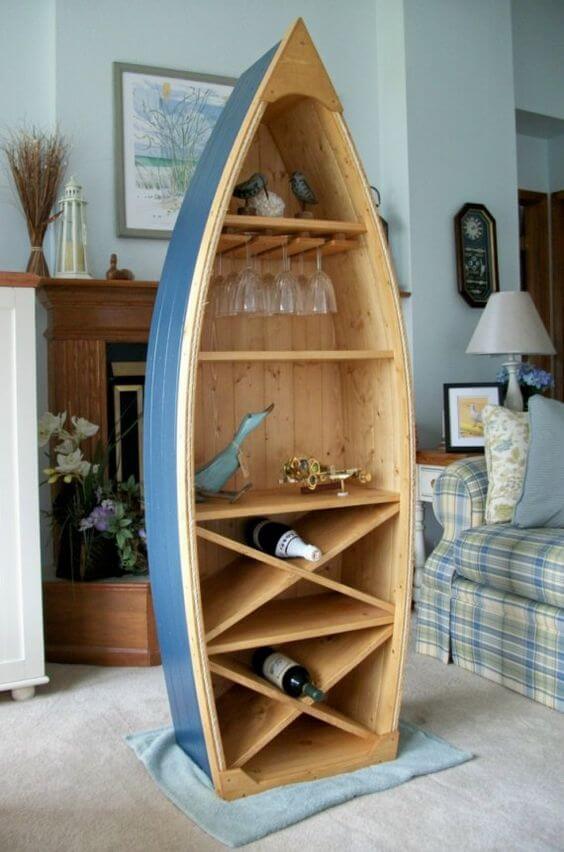 A boat cut in half and mounted upright makes a unique wine shelf. Install horizontal planks inside for bottle storage. Sand and paint the wood for a polished finish.