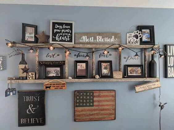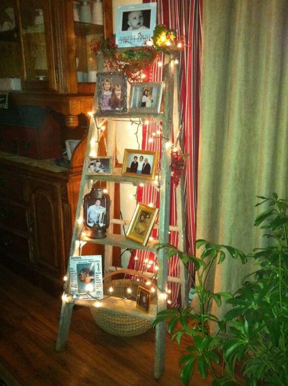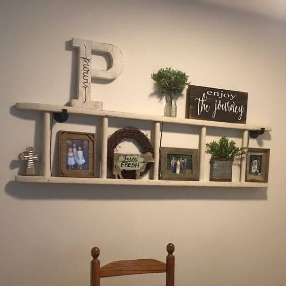 Here s a clever way to turn an old ladder into a rustic display shelf. Mounted horizontally against the wall, this ladder acts as a framework to showcase family photos, framed quotes, and small keepsakes.