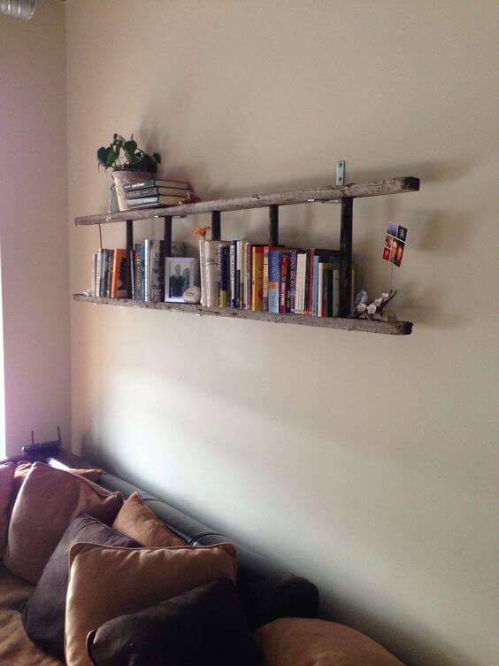 An old wooden ladder can easily become a quirky bookshelf that adds character to your living room. Mounted horizontally on the wall, it provides long, rustic shelving for books, framed photos, and small decorative items.