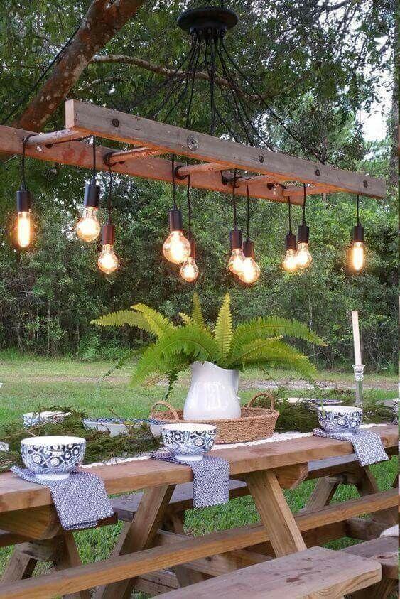 Here s a show-stopping idea for outdoor gatherings: transform an old ladder into a bold chandelier. By suspending it horizontally and attaching vintage-style bulbs, you get a rustic yet elegant light fixture perfect for dining al fresco.