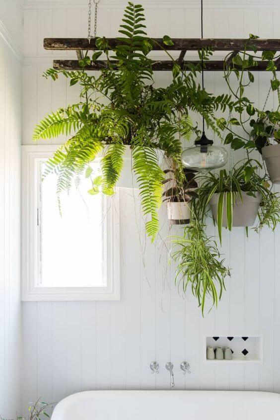 An old wooden ladder can instantly transform your bathroom into a lush, spa-like retreat. In this project, the ladder is suspended from the ceiling with chains and turned into a hanging garden filled with ferns, spider plants, and cascading greenery.
