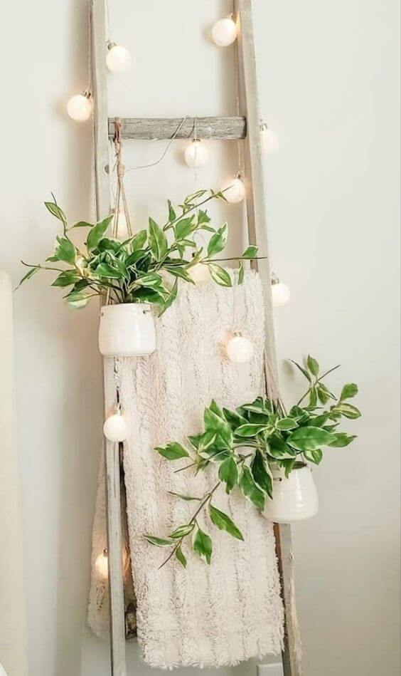 Hanging potted plants brings in a fresh, natural element, making the whole setup feel vibrant and inviting. To recreate this look, drape a favorite throw over the rungs, wrap fairy lights loosely around the ladder, and hang lightweight planters with trailing greenery.