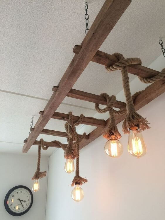This DIY ladder lighting idea brings a magical and rustic touch to any room. A simple wooden ladder is suspended from the ceiling, then adorned with twinkling lights and natural branches to create a whimsical, nature-inspired chandelier.