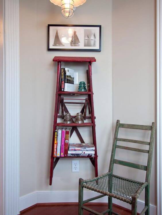 Add shelves across the rungs to hold books, candles, or small keepsakes. With just paint and a little creativity, a simple ladder becomes a functional statement piece that feels both practical and artistic.