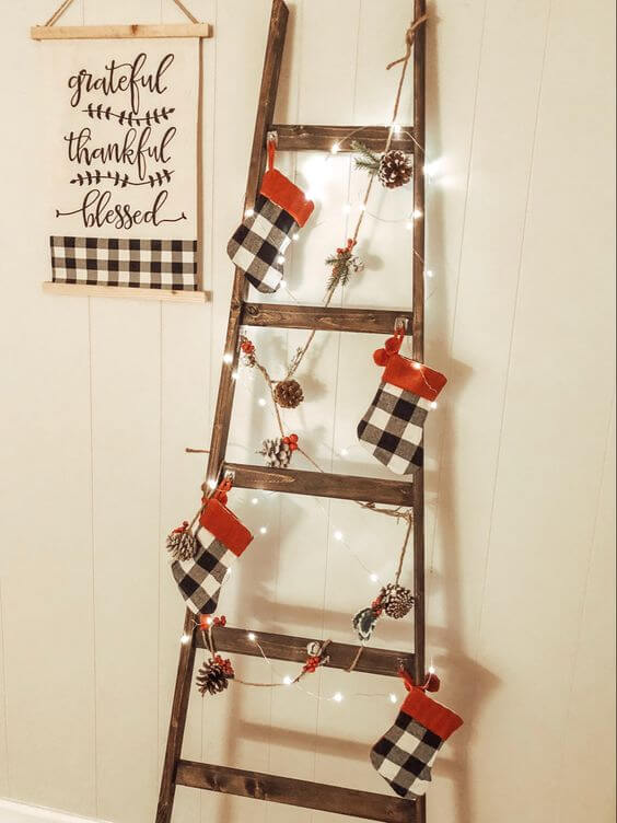 This old ladder turned Christmas display brings a cozy farmhouse vibe to the holidays. Draped with twinkling string lights, mini plaid stockings, and pinecones tied with rustic twine, it feels both festive and homey.
