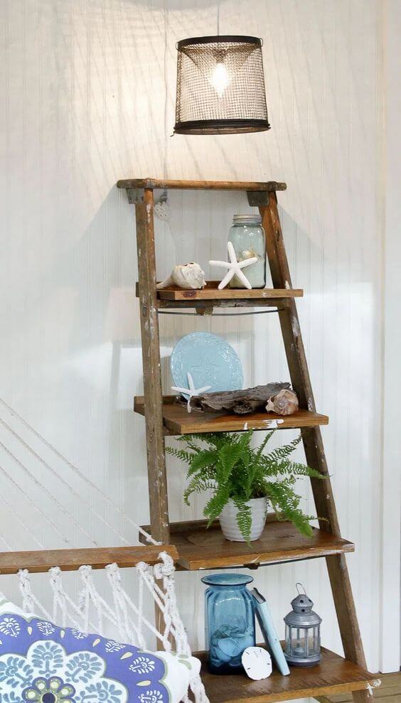 You can style it with plants, jars, books, or coastal accents like in this photo for a breezy, relaxed vibe. To recreate, measure, and cut wooden boards that fit securely across the steps, then sand and stain them to match or contrast the ladder s rustic wood.