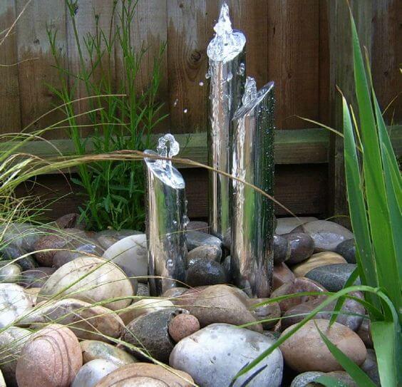 To make it, cut three stainless steel pipes at varying heights and insert a small water pump beneath a bed of river rocks. Let the water rise gently through the pipes, spilling over their edges in soft, shimmering streams.