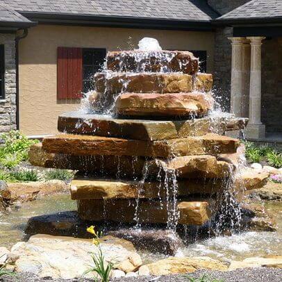 To build it, stack large flat rocks around a concealed pump system, ensuring water flows evenly between each layer. The rough texture of the stones gives a raw, earthy look that complements rustic or modern landscapes.