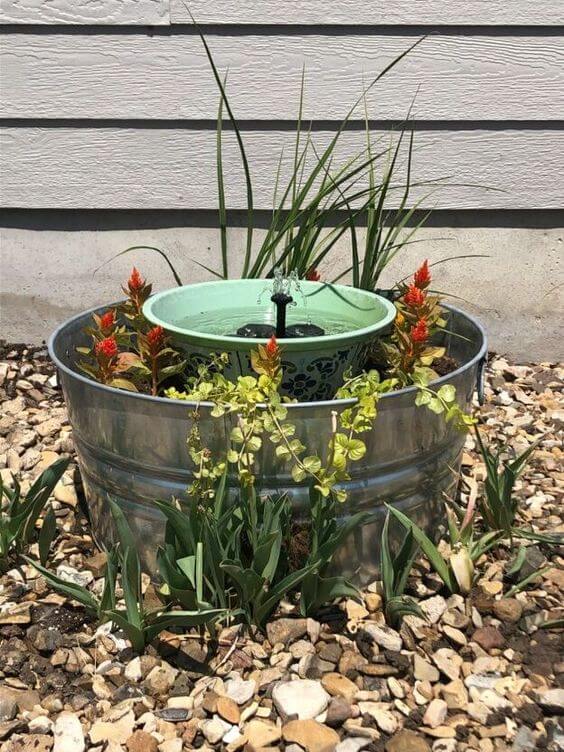 To recreate it, place a smaller bowl or planter inside a galvanized tub and install a compact solar pump in the center. Fill the surrounding space with vibrant flowers and trailing greenery for a full, lush look.