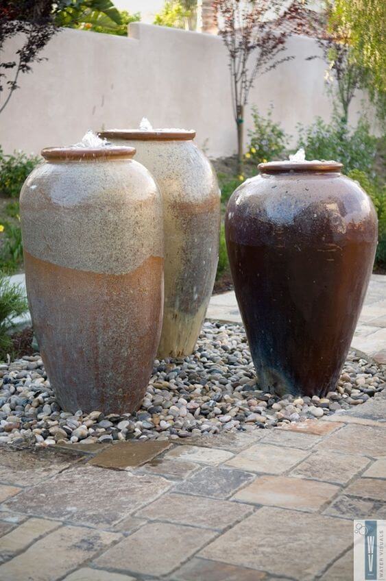 You can build this by connecting three pots of varying heights to a shared underground basin and submersible pump. The gentle water trickle creates a peaceful, spa-like sound that enhances relaxation.