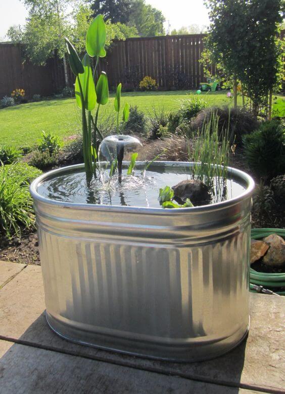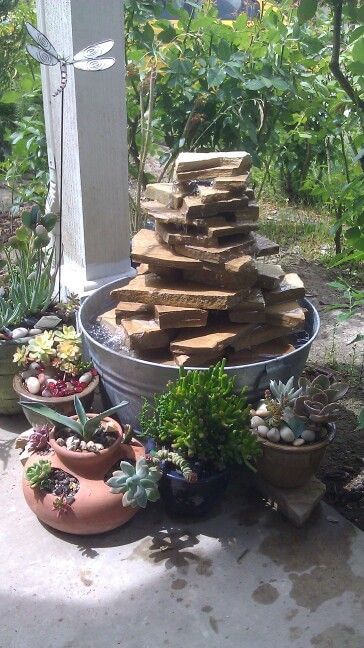 Source: PinterestThis stacked rock fountain nestled in a galvanized basin brings rustic charm and the gentle sound of trickling water to your porch or garden nook.