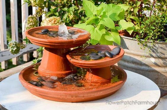 To make it, stack terra cotta pots and saucers of different sizes, sealing the gaps with waterproof adhesive. Add a small submersible pump at the base to circulate the water upward.