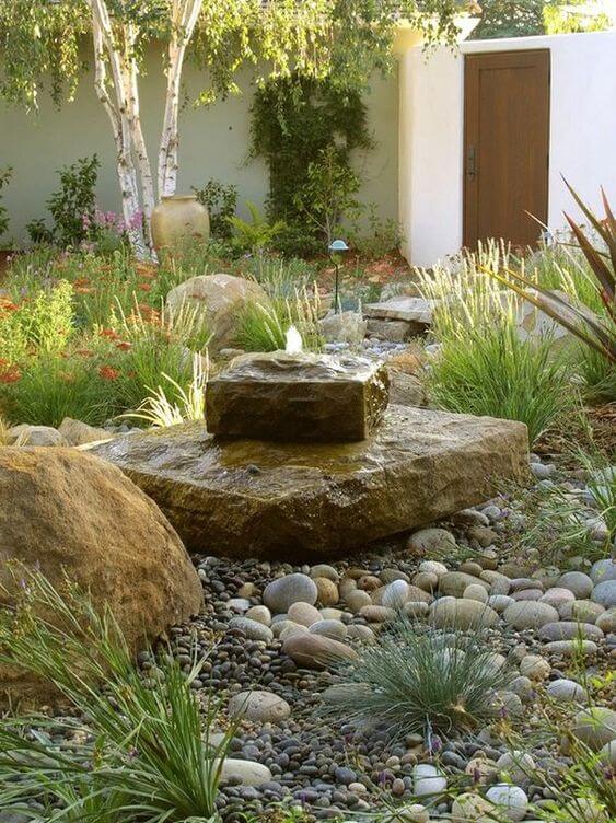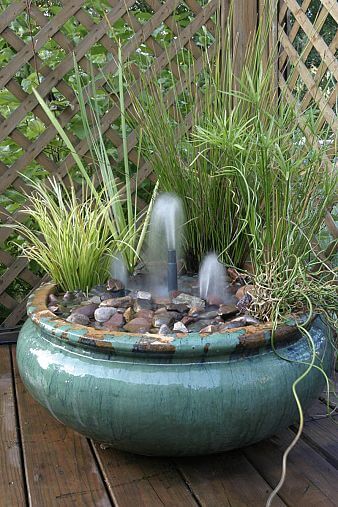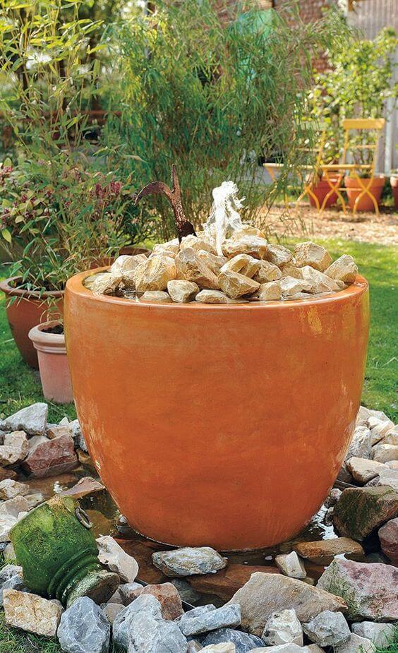 To create it, stack a smaller pot inside a larger one, insert a compact pump through the center, and fill both with water. Place river stones around the spout to soften the bubbling effect.