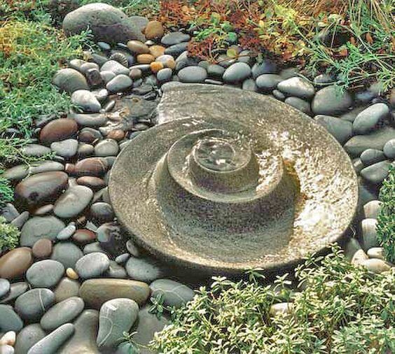 You can mold it using concrete poured into a spiral form or purchase a ready-made flowform and install a submersible pump beneath it. Surround it with smooth pebbles and low-growing succulents to enhance the natural aesthetic.