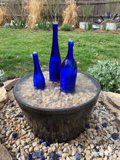 This creative wine bottle fountain turns recycled glass into an elegant backyard centerpiece. The deep blue bottles stand out beautifully against the soft shimmer of flowing water, adding a touch of artistic flair.
