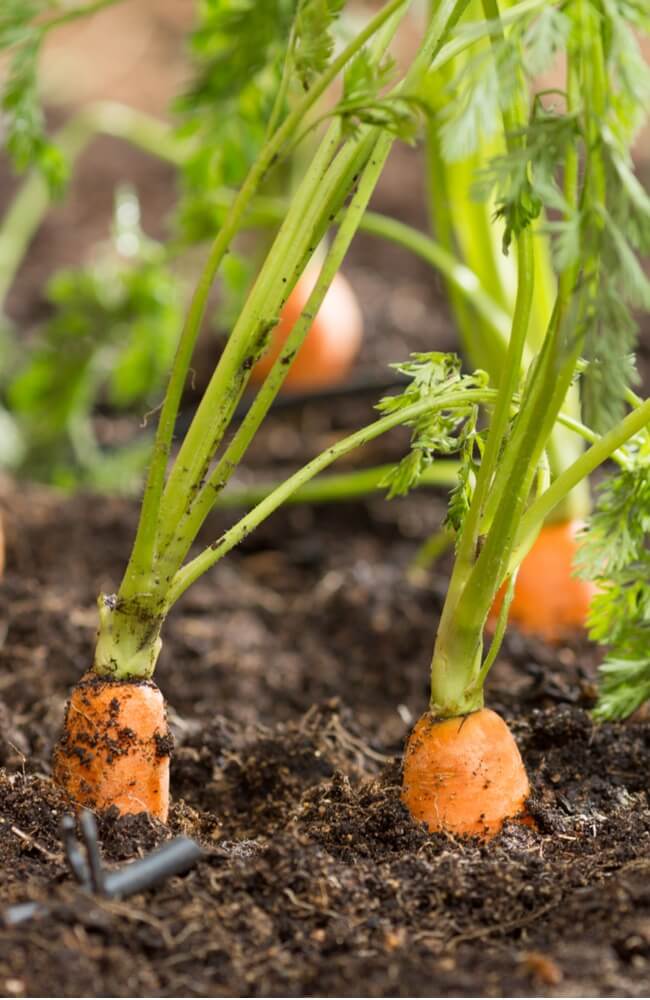 Carrots tolerate partial shade but need loose soil to develop straight roots. Sow seeds directly in the garden and thin seedlings as they grow.