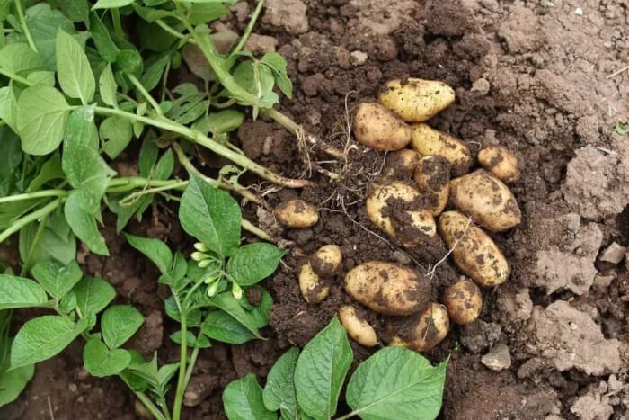 As plants grow, mound soil around stems to protect developing potatoes. Keep the soil consistently moist but not waterlogged. Harvest once plants turn yellow and die back.