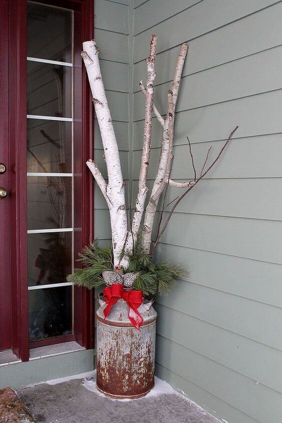 This rustic porch decoration combines nature s raw beauty with a welcoming, festive touch. Birch branches stand tall in an old, weathered milk can, their white bark contrasting beautifully with the muted green wall.