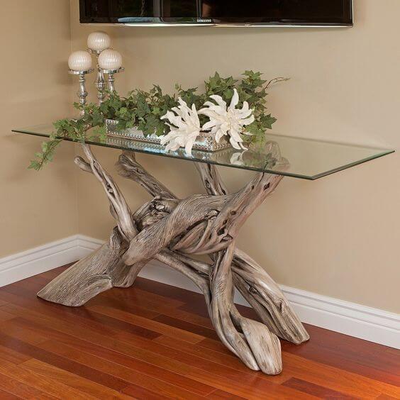 This coffee table blends rustic charm with modern elegance by pairing a solid tree stump base with a sleek, round glass top.