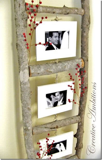 This piece is a charming twist on a photo display; instead of a standard frame or collage, it uses a rustic wooden ladder as the base.