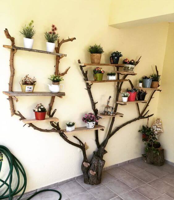 Ideal for showcasing potted greenery, flowers, or decorative items, it combines rustic charm with vertical storage. To recreate it, gather sturdy branches, cut them to fit your wall, anchor them securely, and attach wooden boards for shelving.