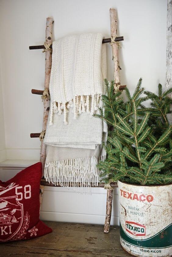 This rustic blanket ladder is crafted from slender birch branches, tied together with natural rope for a charming, handmade look. Leaned casually against the wall, it serves as both a functional storage piece and a cozy decor accent.