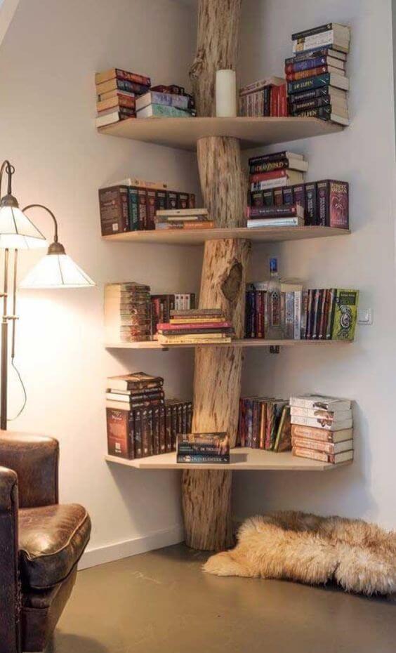 This corner bookshelf turns a simple tree trunk into a striking design feature. The natural wood runs from floor to ceiling, giving the shelves a sturdy anchor and a warm, organic feel.