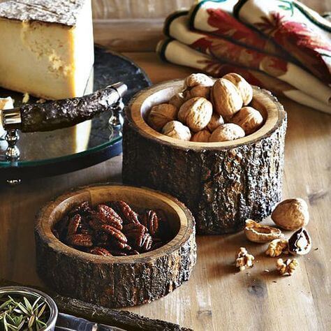The centers have been hollowed out smoothly, creating perfect vessels for holding snacks like walnuts and pecans. They fit beautifully into a cozy, woodland-inspired table setting, especially alongside the cheese board and nature-themed knife in the background.