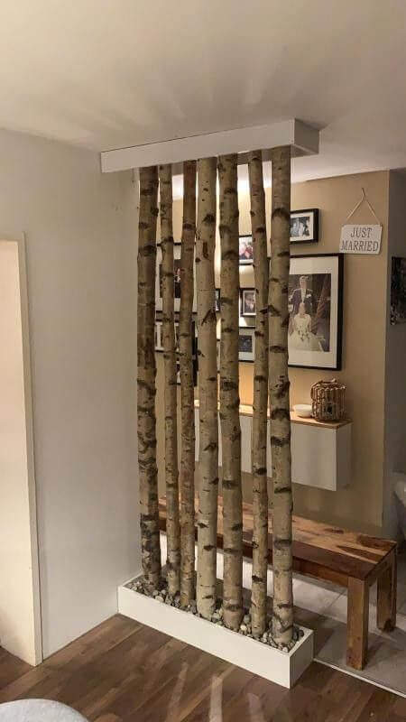 This birch log room divider adds texture and charm without closing off the space. The tall, slender trunks stand in a simple base, creating a natural partition that still lets light flow through.