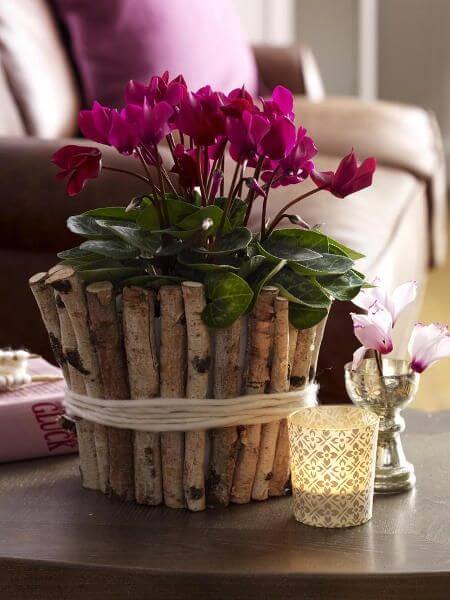This is a charming rustic-style flower pot, wrapped in vertically arranged small birch twigs tied together with natural twine. The vibrant magenta cyclamen flowers add a lively contrast to the earthy tones of the bark.