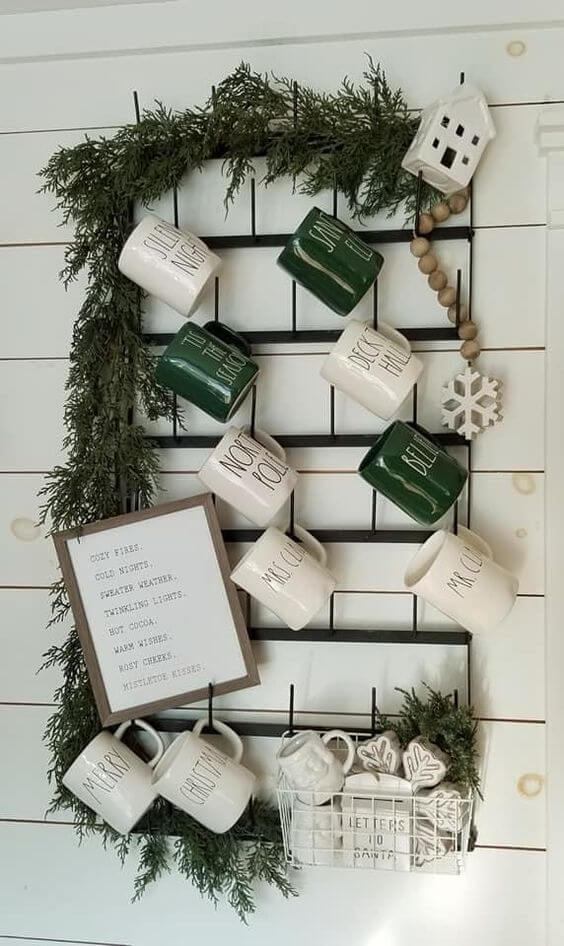 Adding greenery, garlands, or small ornaments makes it even more eye-catching, especially around the holidays. To create a similar look, mount a grid-style rack or metal frame and hang your mugs with hooks.