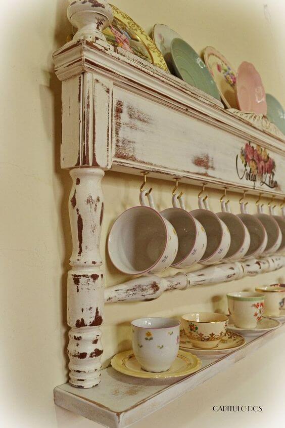 This charming idea breathes new life into an old footboard, turning it into a shabby chic mug rack. The distressed paint gives it a vintage farmhouse vibe, while the hooks provide perfect storage for your favorite mugs.