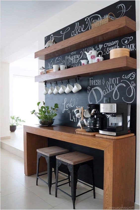 This chalkboard coffee bar is both practical and fun, giving your mornings a creative touch. The blackboard backdrop allows you to doodle quotes, jot down recipes, or even leave sweet notes while your mugs hang neatly from hooks below the shelf.