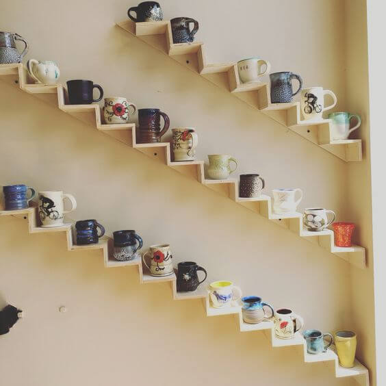 Each cup sits securely on its own step, so you can show off your most colorful or patterned mugs with style. To recreate this, build angled shelves using sturdy wood and mount them in rows across your wall.