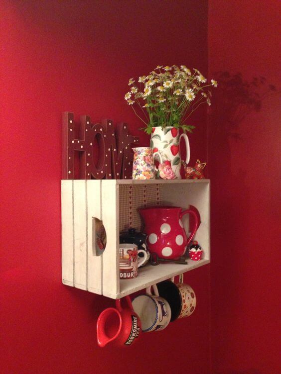 The top surface works as extra display space for flowers, décor, or even more mugs if your collection is large. To make your own, sand and paint or stain a crate to fit your kitchen s style, then secure it firmly to the wall.